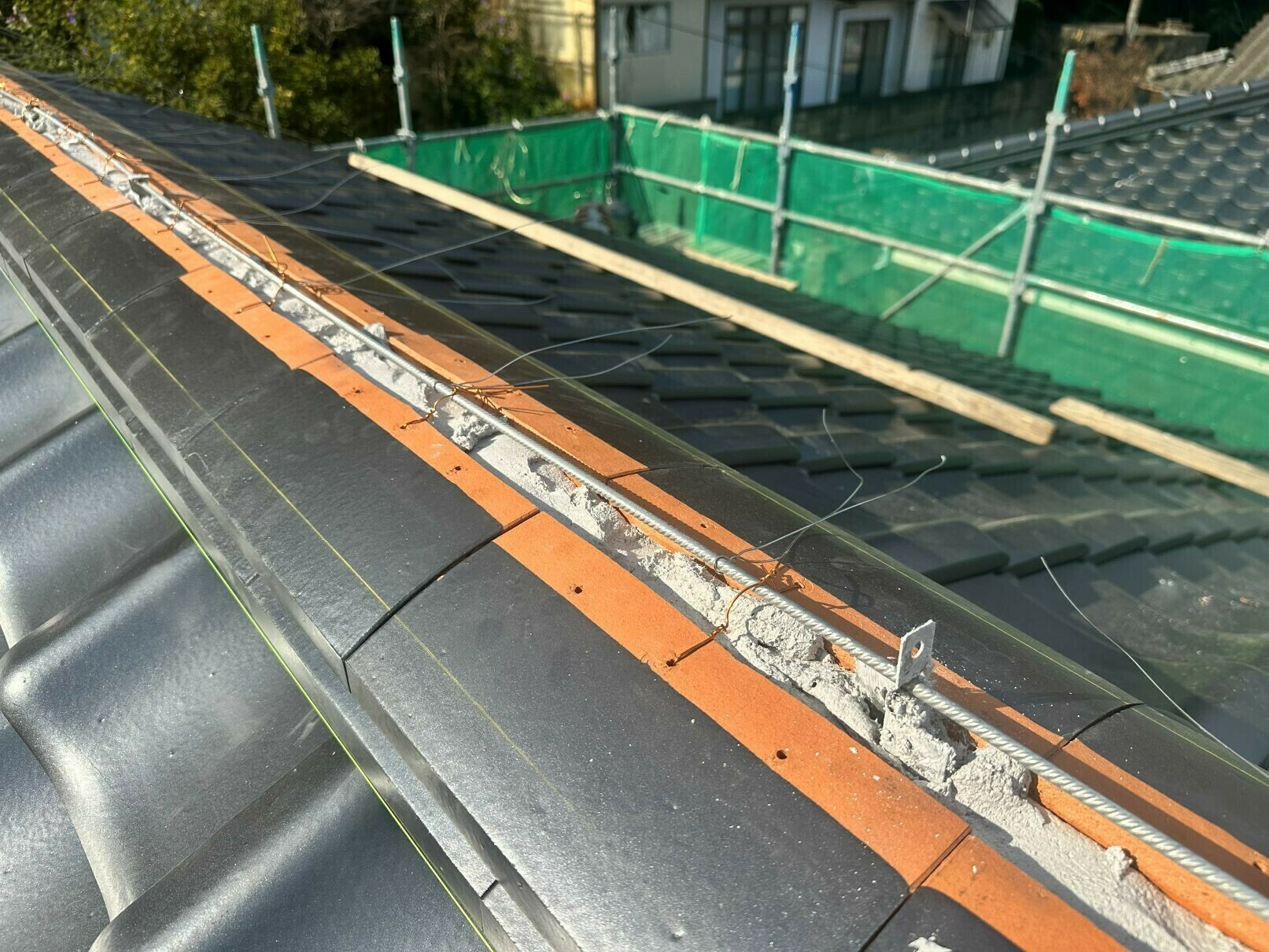 防災工法ですので熨斗瓦同士はホルマル銅線で緊結、棟芯には棟金具を取り付けてあり、芯材のメッキ鉄筋から雁振り瓦の緊結用ステンレス線をだします。