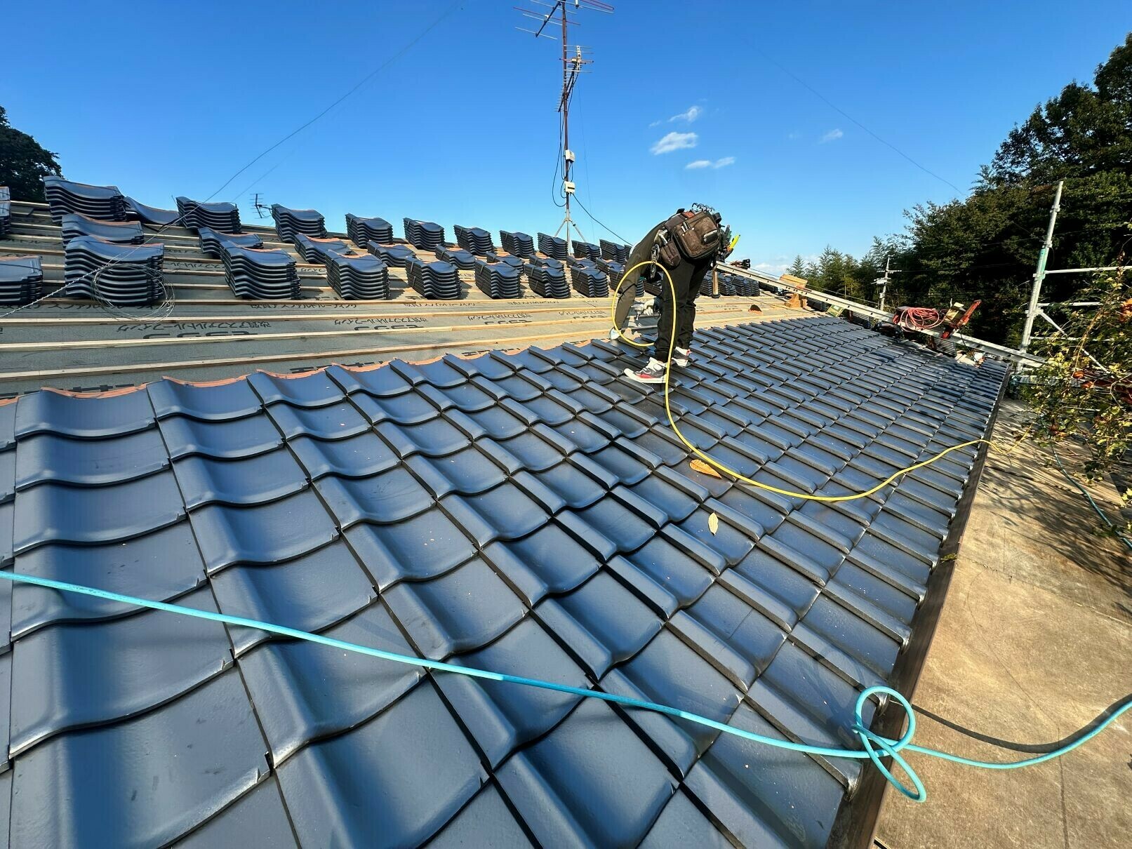 というのも、瓦を上げてしまうと、上手く雨養生のシートが貼れなくなるので💦天気を見たりしながら瓦上げるタイミングを調整したり、丸一日休憩しないで瓦葺き上げたりと💦なかなか気を使います💦